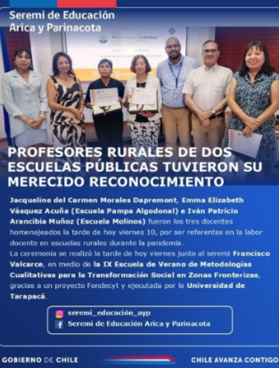 Además, en esta instancia se realizó un reconocimiento a 2 profesoras y 1 profesor de escuelas rurales por su labor en pandemia, en esta ceremonia participó nuestra socia Dra. Jenniffer Peralta Vicerrectora de Desarrollo Institucional de la Universidad de Tarapacá.